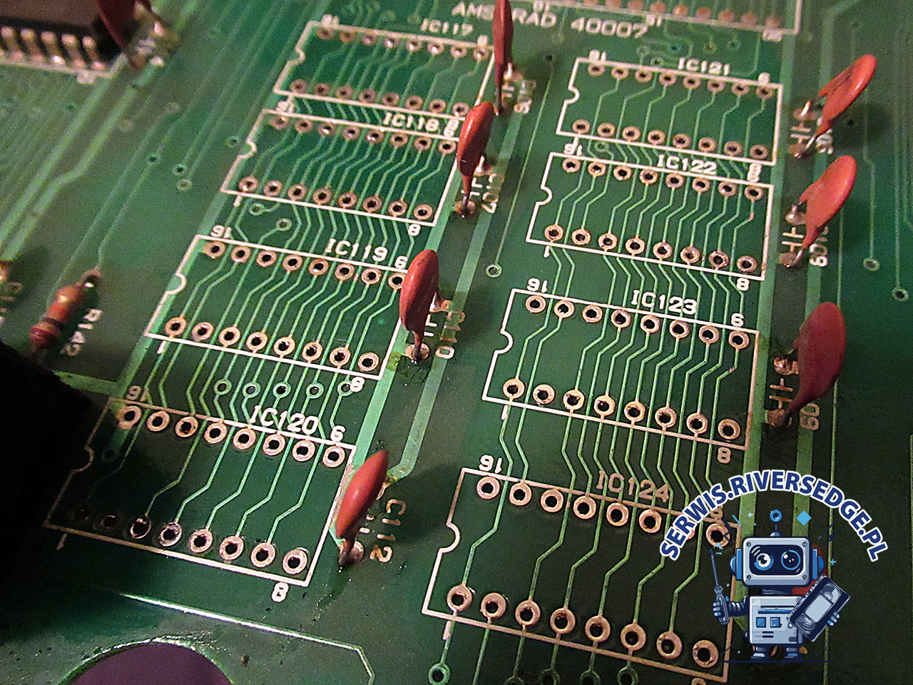 W pierwszej kolejności przystąpiłem do wylutowania wszystkich 8 kości pamięci 4164. Aż 6 z nich było uszkodzonych! 19-voltowy strzał przeżyły cudem wyłącznie kości IC117 i IC121. Po wlutowaniu podstawek i wstawieniu sprawnych kości, komputer przywitał mnie tzw. szarym ekranem śmierci. Jak się okazuje, symptom ten w CPC464 nie dotyczy wyłącznie problemów z pamięcią.