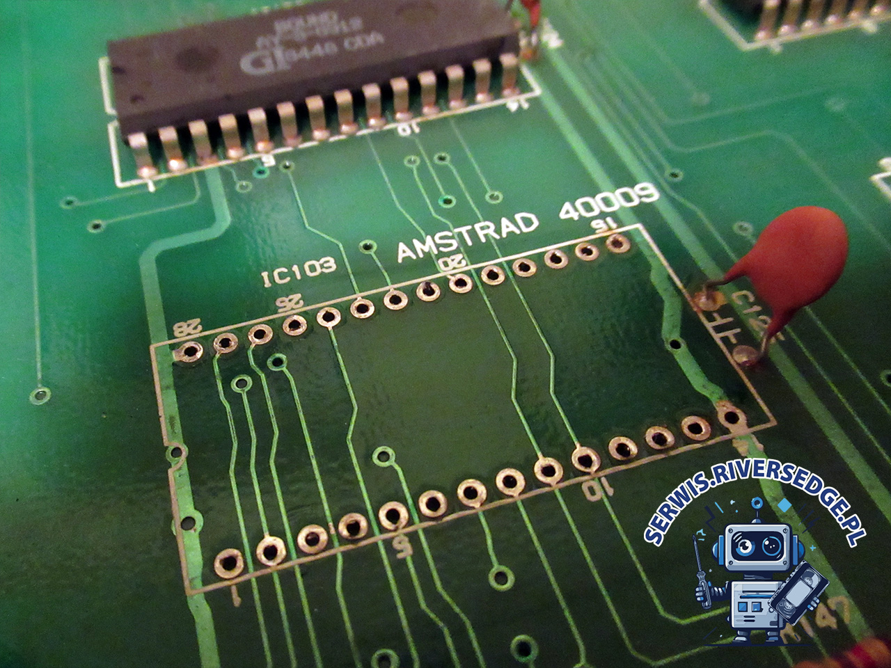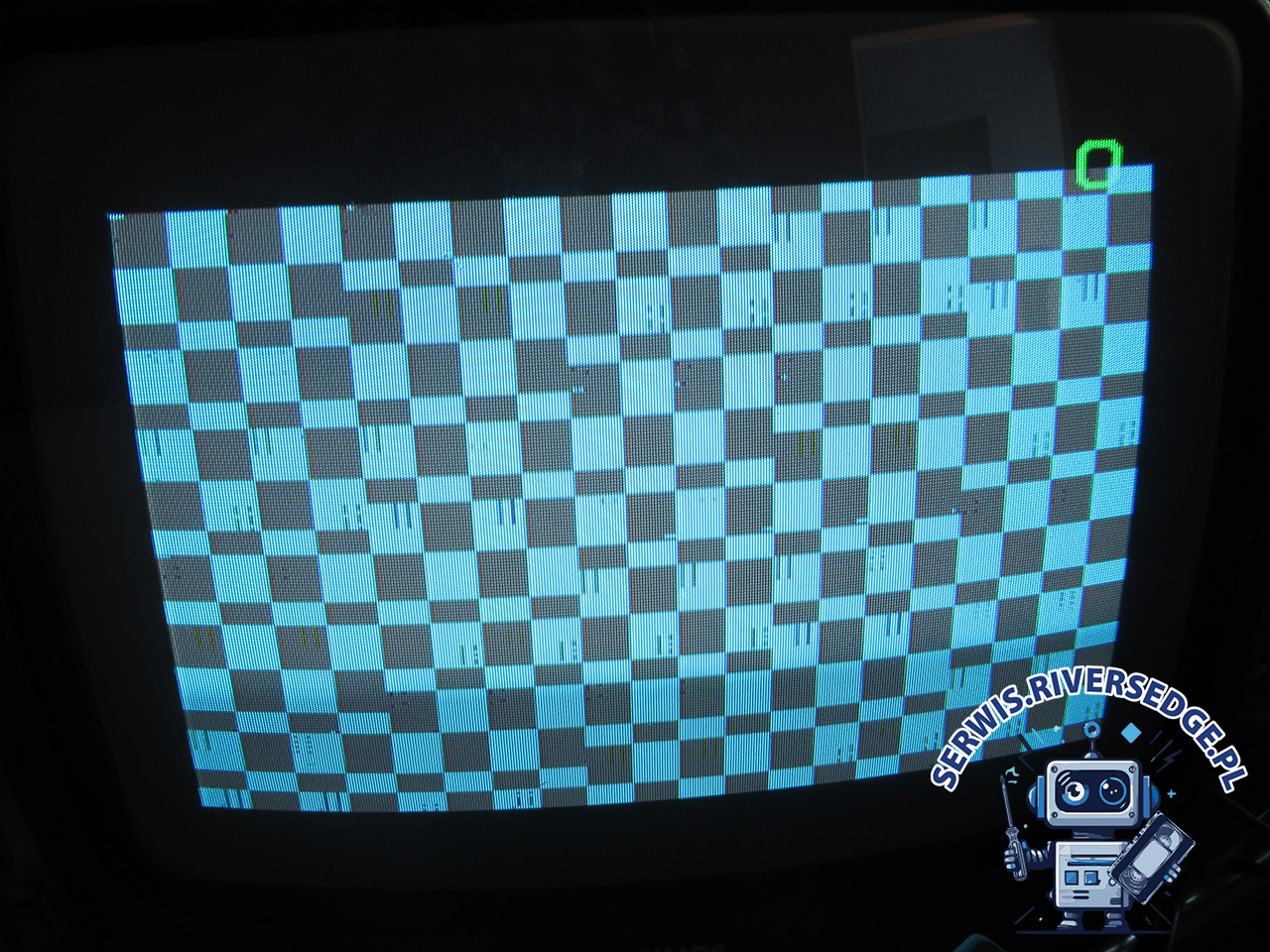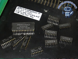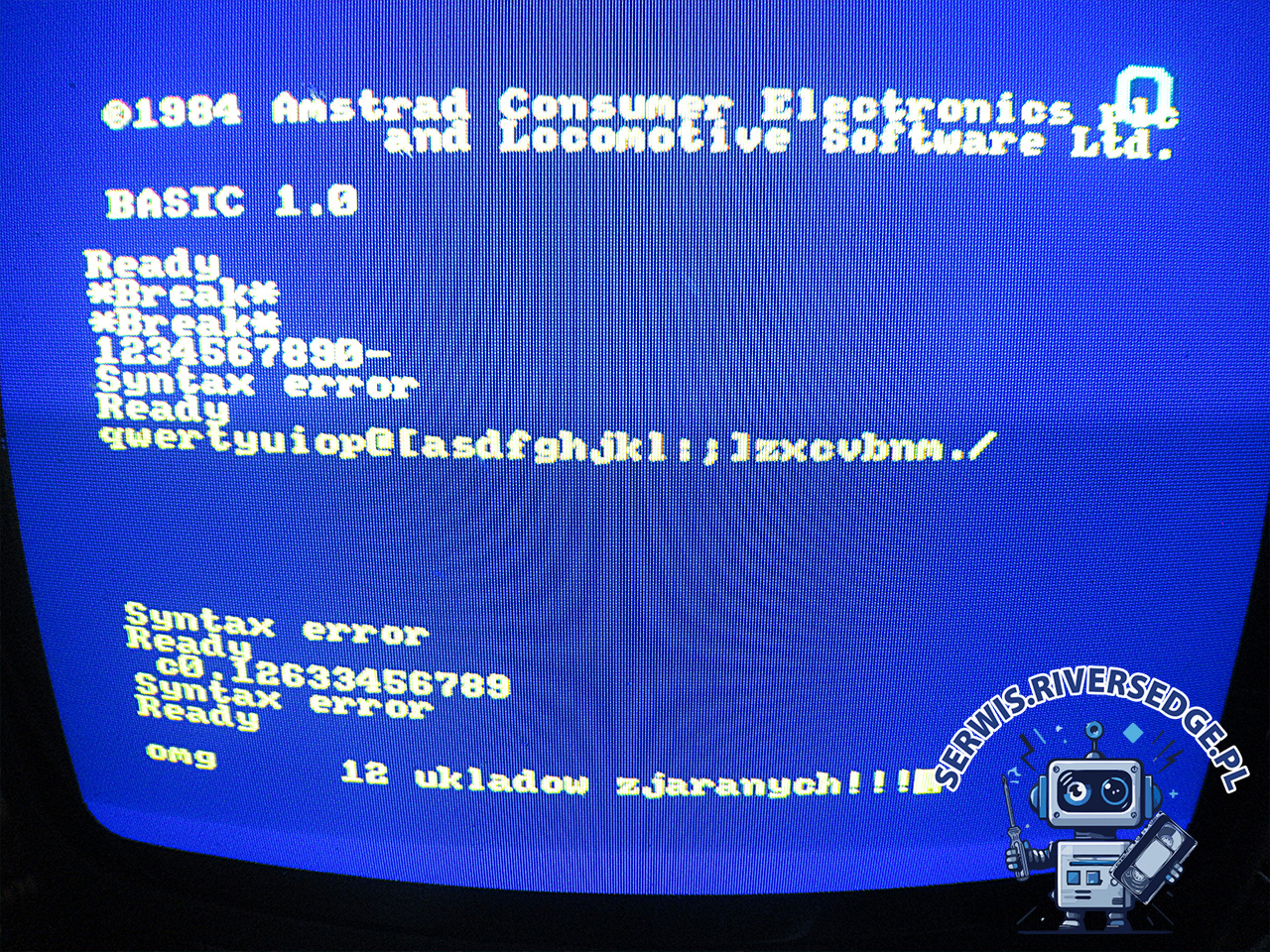 Następnie zweryfikowałem poprawność działania kontrolera video HD46505SP, Gate Array 40010 oraz procesora, by po chwili wykryć uszkodzenie ROM-u (IC103) o oznaczeniu 40009. Na szczęście można go samodzielnie odtworzyć przy wykorzystaniu układu EPROM o pojemności 32 KB. Komputer jednak w dalszym ciągu się nie uruchamiał. Przystąpiłem zatem do weryfikacji poprawności działania układów TTL, znając ich wrażliwość na zawyżone napięcie zasilania. Po wymianie układów IC114 (74373) i IC115 (74244), CPC464 zaprezentował pierwsze oznaki życia pod postacią ekranu z białymi, niebieskimi i zielonymi krzakami. Po wymianie układu IC106 (742373) na ekranie ujrzałem szaro-cyjanową szachownicę. Następnie zdiagnozowałem uszkodzenia kolejnych elementów o oznaczeniach IC103, IC113 i IC114. Po wstawieniu sprawnych układów komputer wreszcie zaprezentował prawidłowy ekran startowy. Dalsze testy nie wykazały innych uszkodzeń. CPC464 bez problemu wczytał i uruchomił grę z kasety.