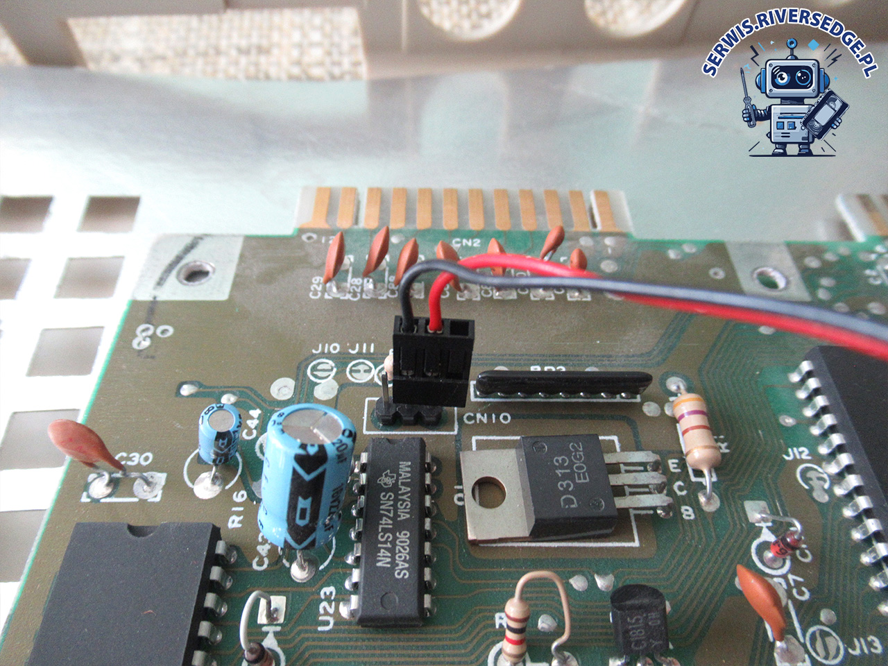 Komputer Commodore 64G z kolekcji Szczepana. Przysłany na serwis w celu usunięcia usterki polegającej na wyświetlaniu tzw. czarnego ekranu śmierci, który pojawił się rzekomo po wyczyszczeniu wnętrza sprężonym powietrzem.  Ponadto w komputerze nie świeciła zielona dioda POWER LED. Oględziny płyty głównej nie wykazały śladów wcześniejszej naprawy.