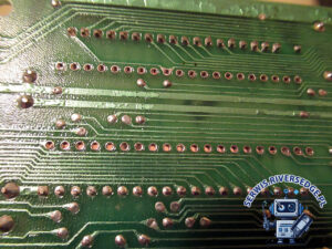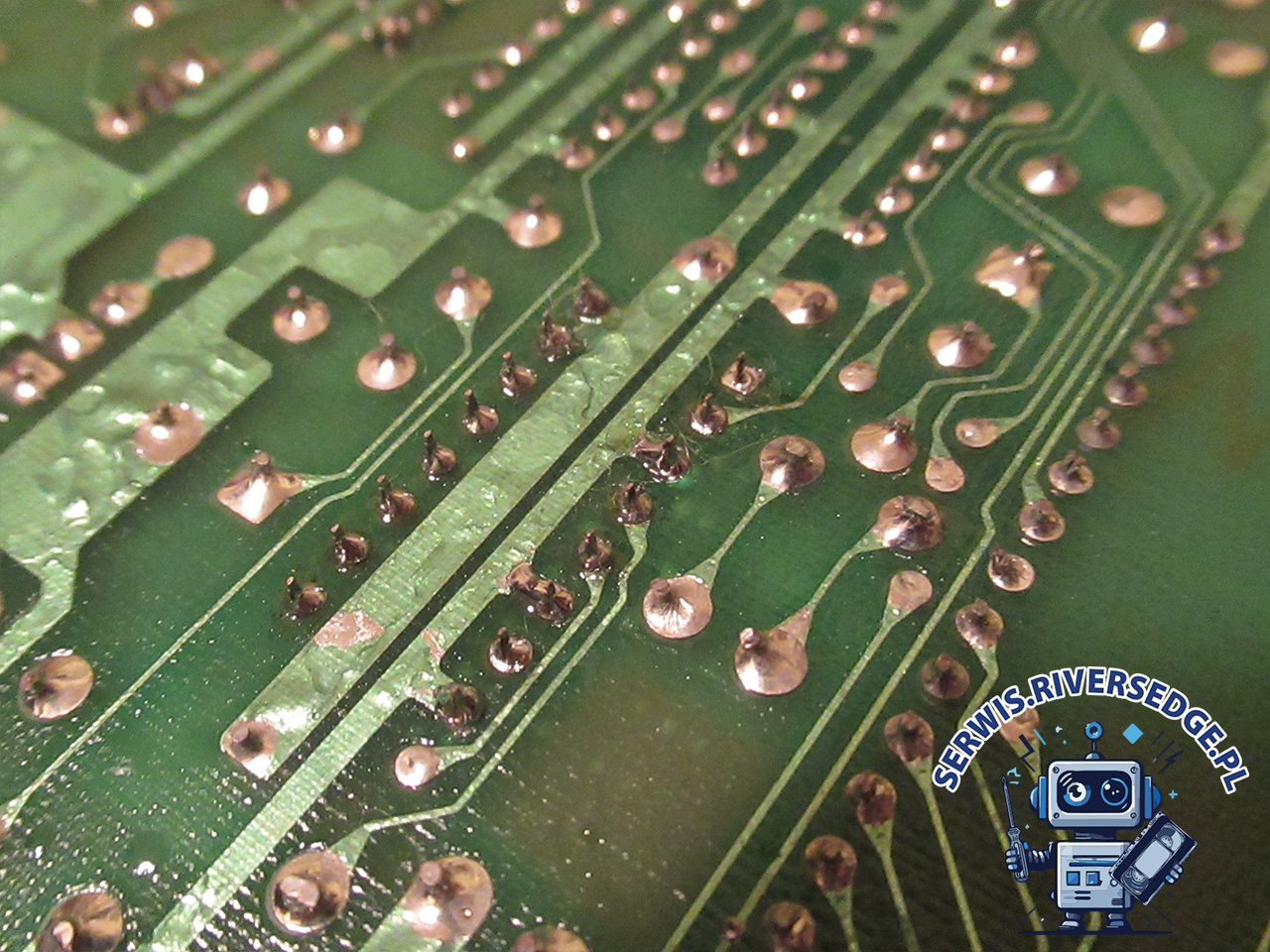 Pierwsze uruchomienie płyty głównej w warunkach serwisowych potwierdziło występowanie usterki, jednakże nie była ona typowa dla większości przypadków tzw. czarnego ekranu śmierci. Komputer generował na czarnym tle drobne „zakłócenia” w szarym kolorze. Objaw ten wskazywał na uszkodzenie oscylatora 74LS629N. I rzeczywiście – po wymianie układu komputer zgłosił się z prawidłowym ekranem startowym.