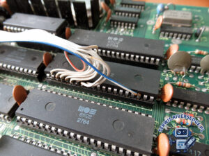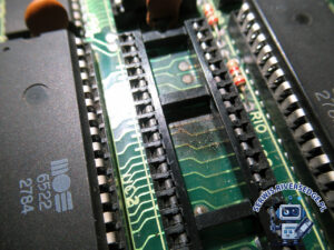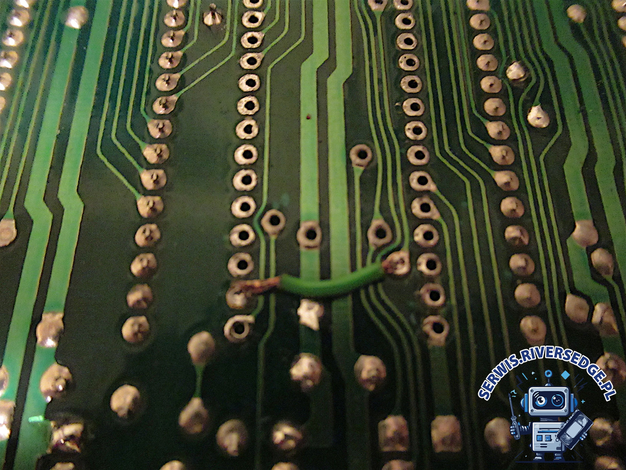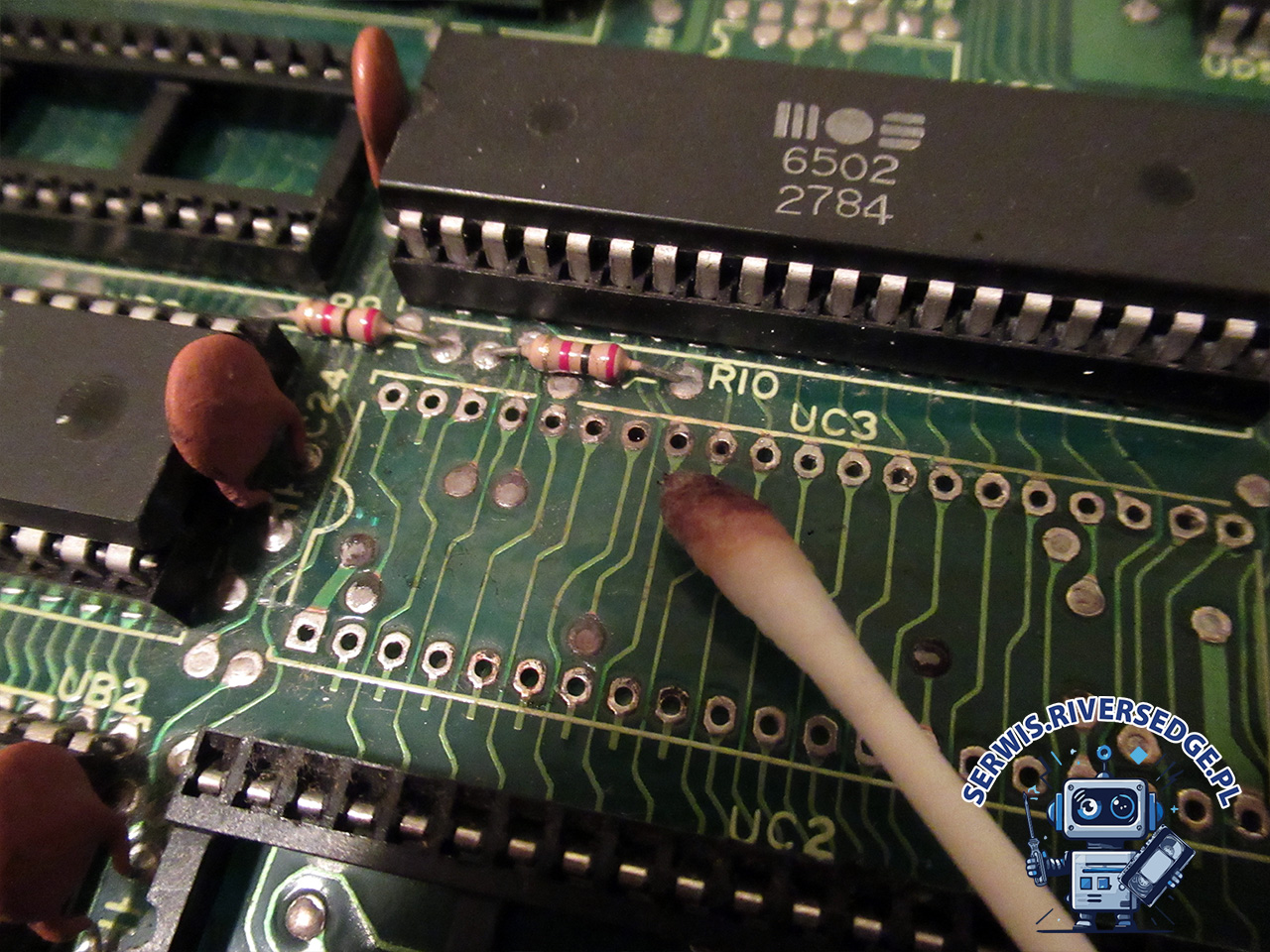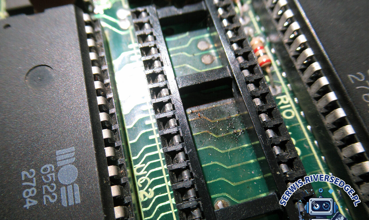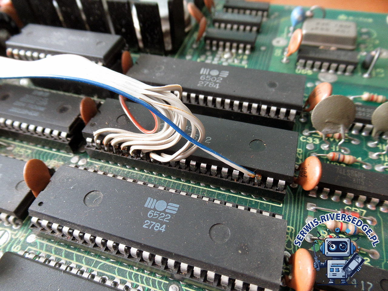 W pierwszej kolejności (po konsultacji z właścicielem urządzenia) odlutowałem przewód łączący układ VIA 6522 z wtykiem gniazda, który był przeznaczony do podłączania do gniazda User Port w Commodore 64. Przy tej okazji odkryłem pod układem ślady zalania lepką substancją (najprawdopodobniej słodkim napojem), co zmusiło mnie do wylutowania oryginalnej podstawki.