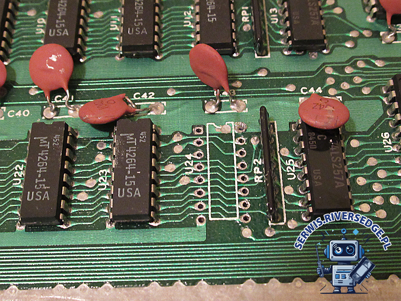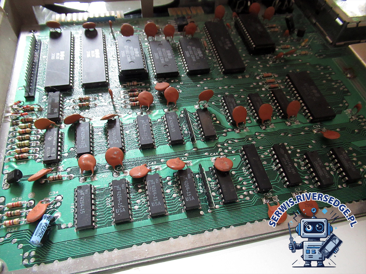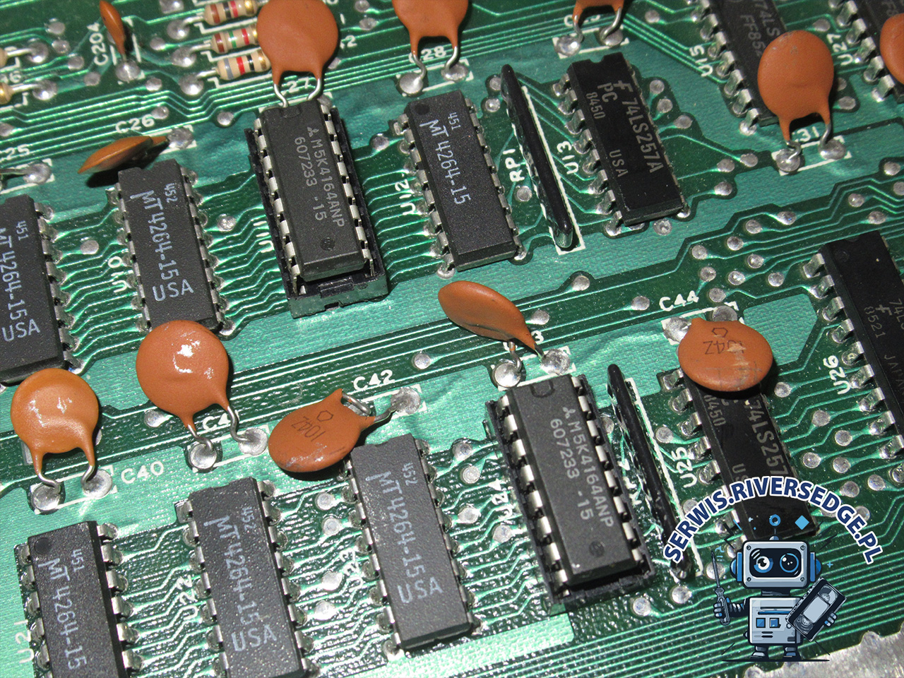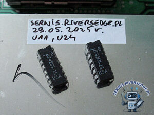 Pierwsze uruchomienie komputera potwierdziło obecność usterki. Testy diagnostyczne pozwoliły wytypować dwie uszkodzone pamięci RAM 4164: U11 i U24. Po ich demontażu, wstawieniu podstawek oraz zainstalowaniu sprawnych układów, komputer wyświetlił prawidłowy ekran startowy. Dalsze testy nie wykazały obecności innych usterek. W ramach kompleksowej usługi serwisowej dokonałem dodatkowo wymiany złamanego młoteczka w klawiaturze oraz uzupełniłem ją o brakujący klawisz.